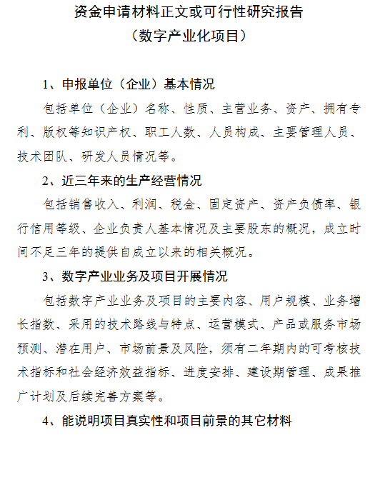 (1)數(shù)字產(chǎn)業(yè)化項(xiàng)目。申報(bào)主體為服務(wù)業(yè)企業(yè)的,要求2022年?duì)I業(yè)收入應(yīng)在1000萬元以上、且當(dāng)年稅收在10萬元以上,優(yōu)先支持規(guī)模以上企業(yè);申報(bào)主體為制造業(yè)企業(yè)的,應(yīng)為規(guī)模以上工業(yè)企業(yè)、且2022年稅收在100萬元以上企業(yè),優(yōu)先支持具有兩化融合管理體系貫標(biāo)認(rèn)證資質(zhì)的企業(yè)。